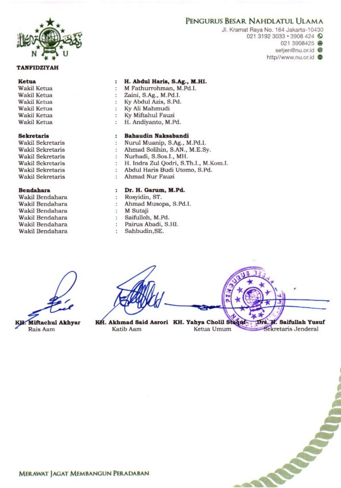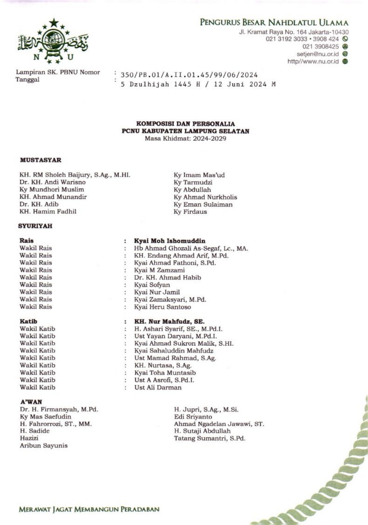 SK Pengurus PCNU Kabupaten Palu Periode 2024-2029